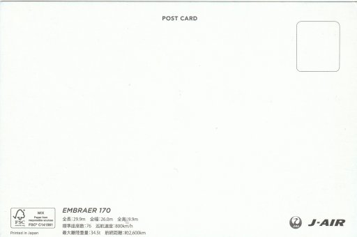 Airline issue postcard - J-Air / JAL Japan Airlines Embraer 170